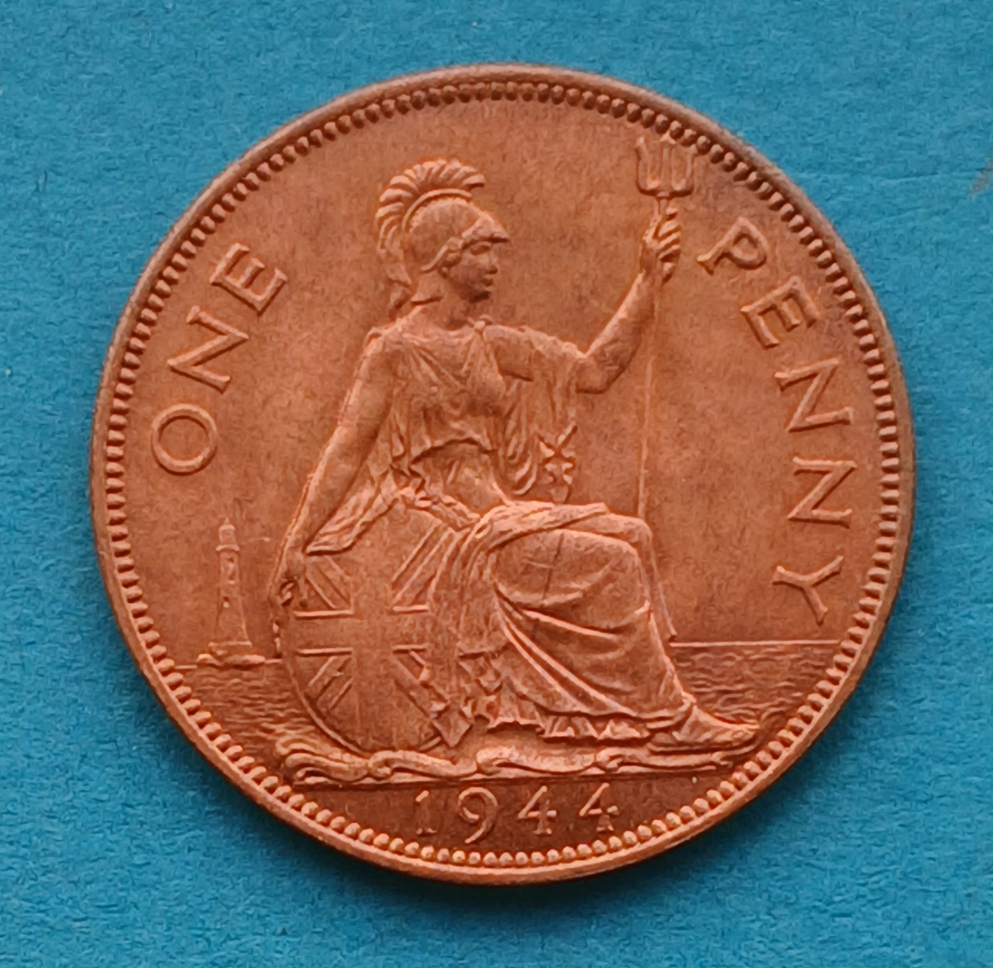 George VI penny from 1944 High grade coin with light toning.