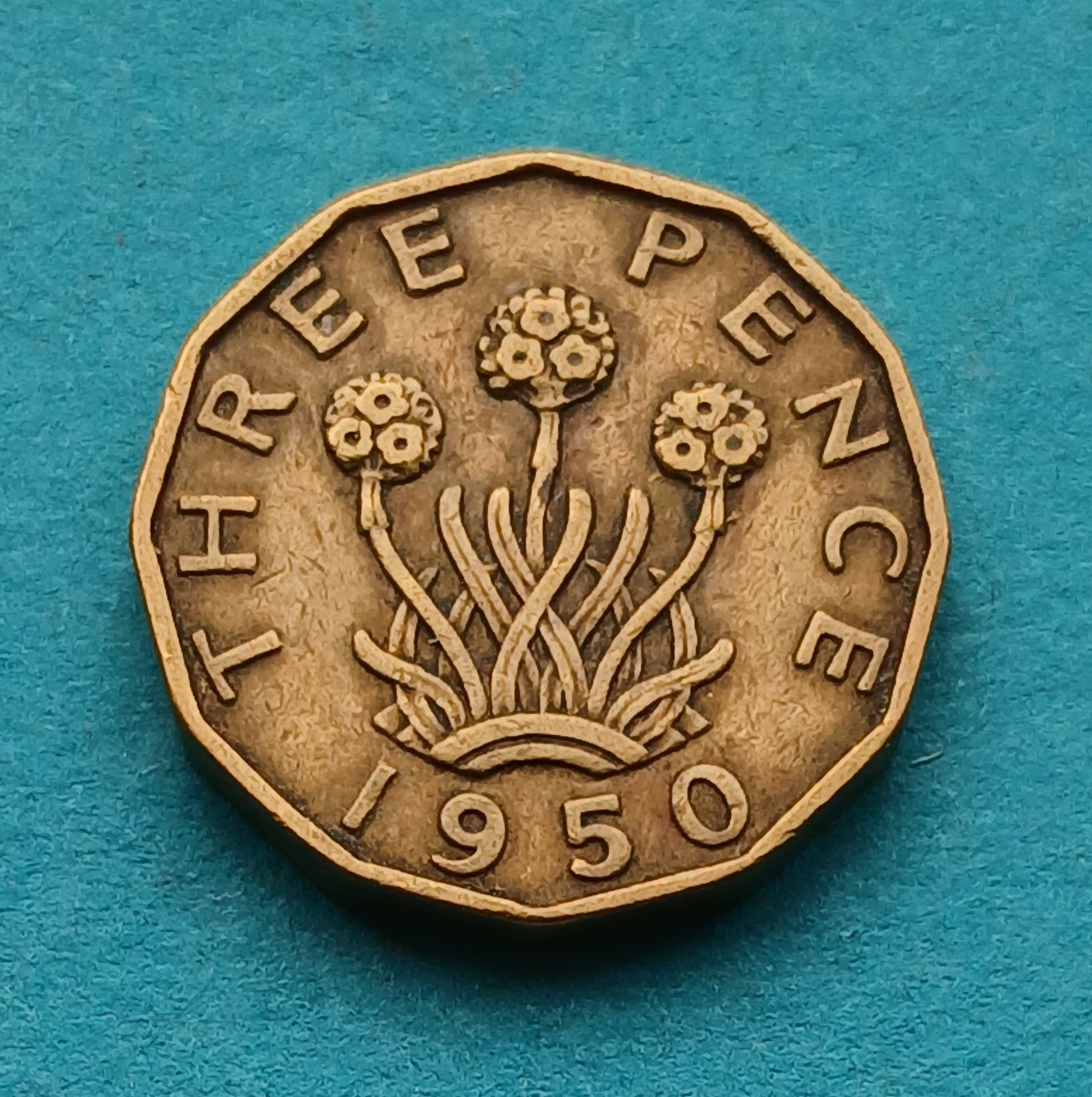 George VI 1950 ThreePence. Scarce Scarce Scarce. Harder to find starter coin … usual marks and scrapes. This coin is representative to the one you will recieve.